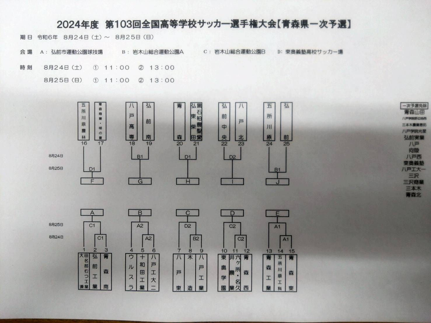 2024年度 第103回全国高等学校サッカー選手権大会(青森県1次予選)(組み合わせ) X Facebook はてブ Pocket LINE コピー 2024.07.26 組み合わせが決まりました。 工業は8月25日(日)11時からです。場所は弘前市運動公園球戯場